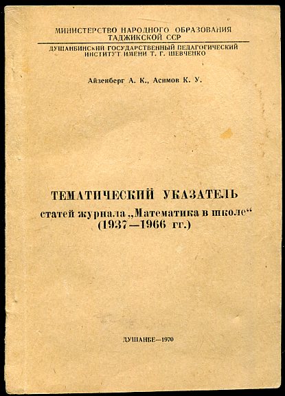 Айзенберг А.К., Асимов К.У. Тематический указатель статей журнала Математика в школе 1937-1966 гг. Предисловие авторов. Душанбе: Душанбинский государственный педагогический институт им. Т. Г. Шевченко 1970г. 194 с. Палiтурка / переплет: Мягкий, обычный формат.